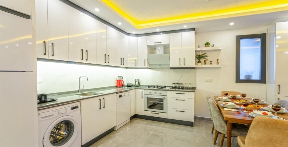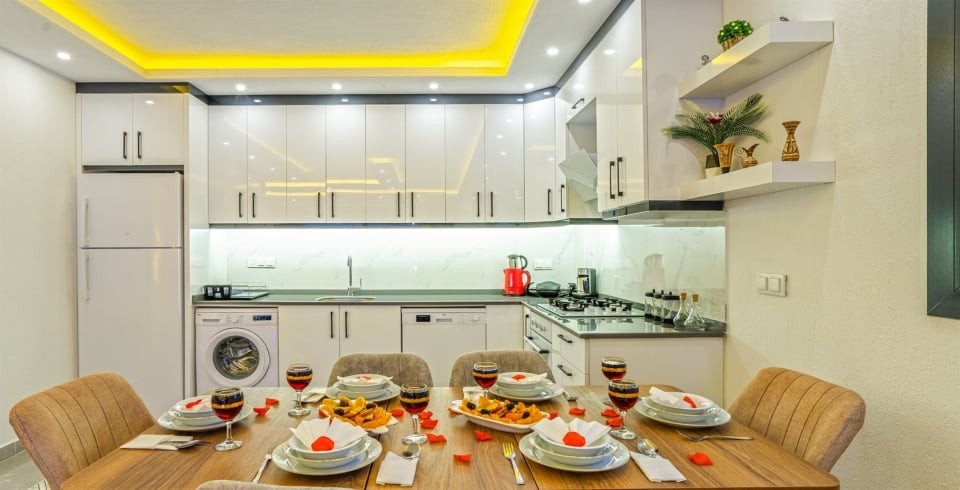 Mutfak : Buzdolabı, bulaşık makinası, çamaşır makinası, kettle, kahve makinası, fırın, mikrodalga fırın, ocak, yemek masası, yemek takımları, tencere tava takımları, çaydanlık bulunmaktadır.
