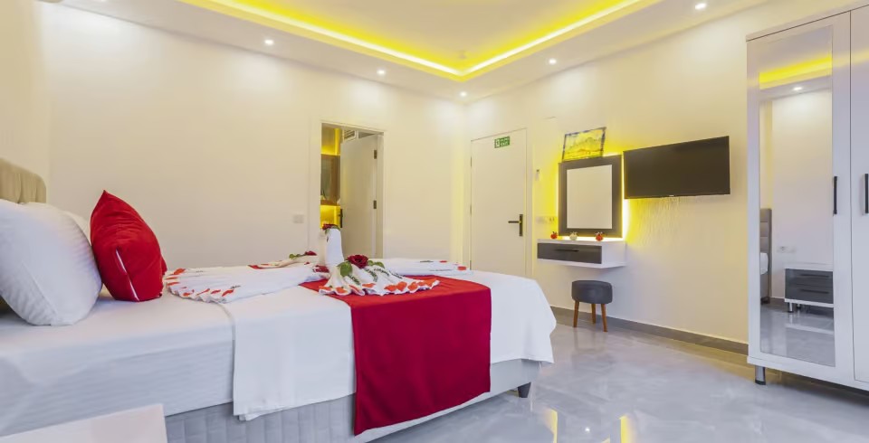Yatak Odası : 1 adet çift kişilik yatak, klima, elbise dolabı, makyaj masası, komodin, banyo ve lavabo bulunmaktadır.