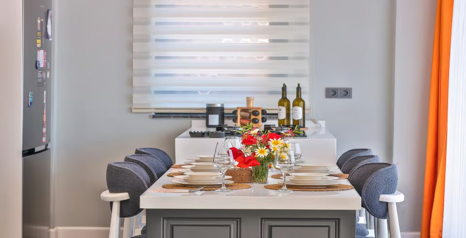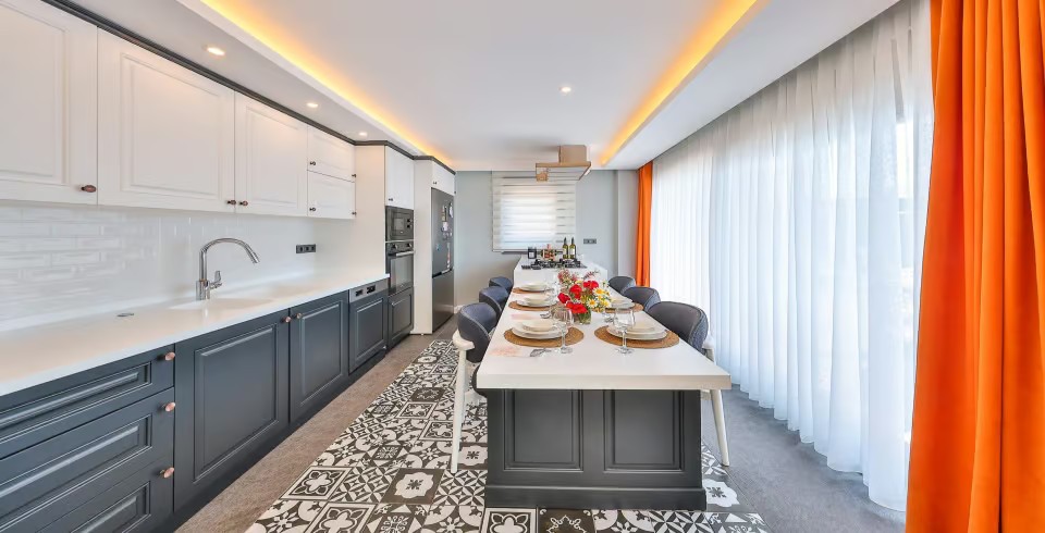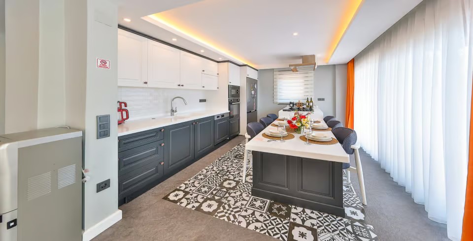 Muftak : Tam donanımlı modern Amerikan mutfak içerisinde bulaşık makinesi , buzdolabı fırın, ocak, elektrikli su ısıtıcı, kahve makinesi ,yemek masası, yemek takımları, çatal ve bıçak takımları, tencere ve tava takımları ve bardaklar bulunmaktadır.