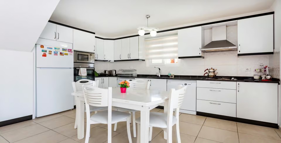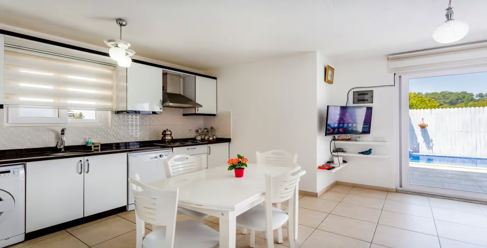 Mutfak : Villamızın geniş Amerikan mutfağı ile sizlere kendi evinizin mutfağı gibi hissettirecek. Ayrıca mutfakta klima, bulaşık makinası, buzdolabı, çamaşır makinası, mikrodalga fırın, tost makinası, ekmek kızartma, su ısıtıcısı, fırın, 4`lü ocak seti ve 6 kişilik geniş yemek masası ile tava tencere vb. mutfak araç gereçlerini kullanma fırsatını sizlere sunuyoruz.