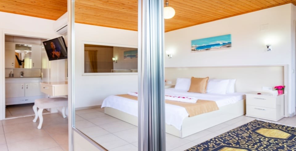 1. Yatak Odası : 1 adet çift kişilik yatak, klima, komodin, elbise dolabı, makyaj masası, TV, Jakuzi, banyo ve lavabo bulunmaktadır.