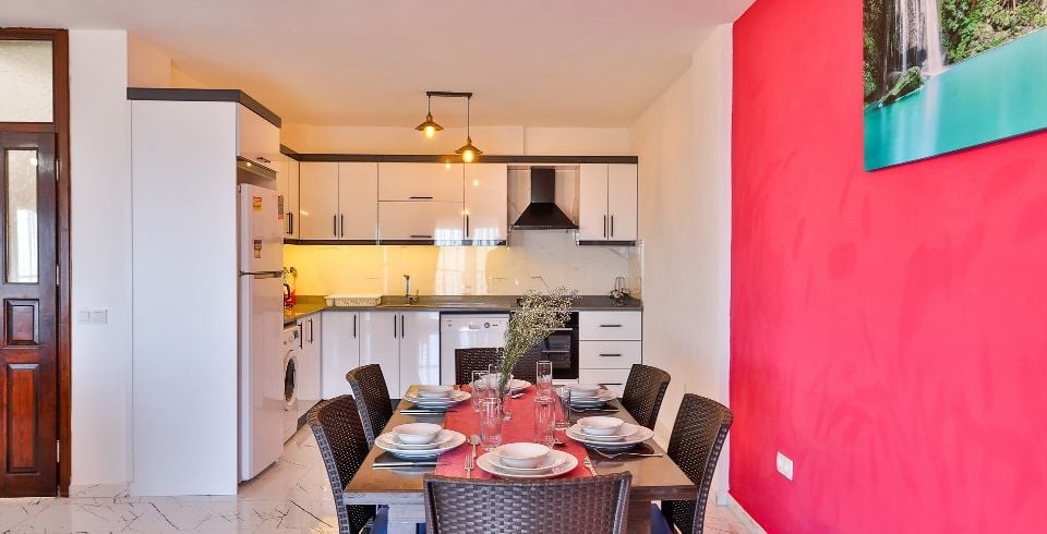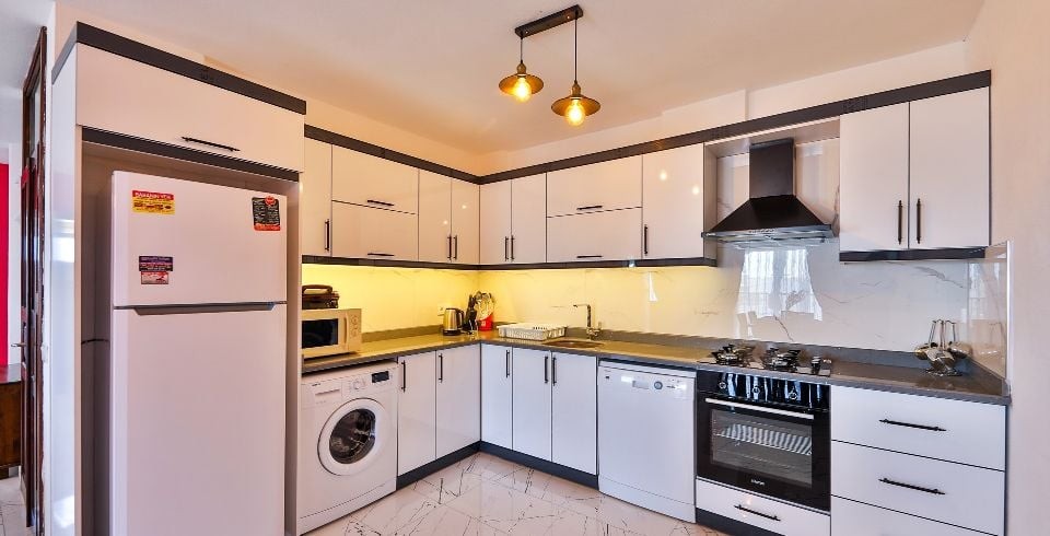 Mutfak : Modern Amerikan mutfak, deniz ve doğa manzaralı (havuz katında), buzdolabı, bulaşık makinası, çamaşır makinası, ankastre fırın, mikrodalga fırın, ankastre 4’lü ocak, kettle, ekmek kızartma makinası, 6 kişilik yemek takımı, tava, tencereler, çatal, bıçak vs.