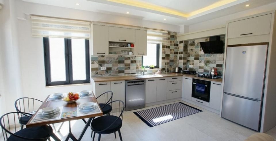 Mutfak : Buzdolabı, çamaşır makinesi, bulaşık makinesi fırın, mikrodalga fırın, 4’lü ocak, su ısıtıcı (kettle), tost makinesi, yemek masası ve 4 kişi için mutfak takımı bulunmaktadır.