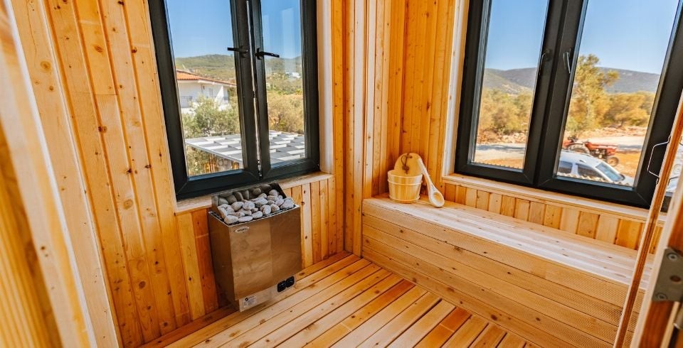 Havuz ve Bahçe : Çam ağaçları arasında, şemsiye, bahçe mobilyası, şezlong, mangal ve yemek masası bulunmaktadır.