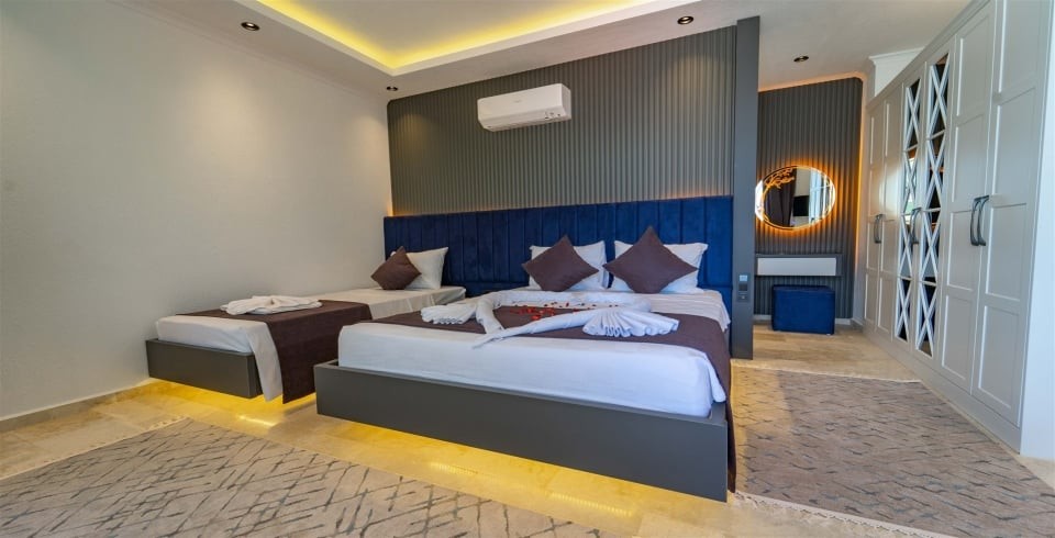 2. Yatak Odası : Bir adet çift kişilik yatak , bir adet tek kişilik yatak, komodin, elbise dolabı, makyaj masası, klima, banyo ve tuvalet bulunmaktadır.