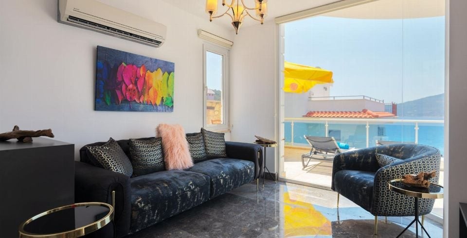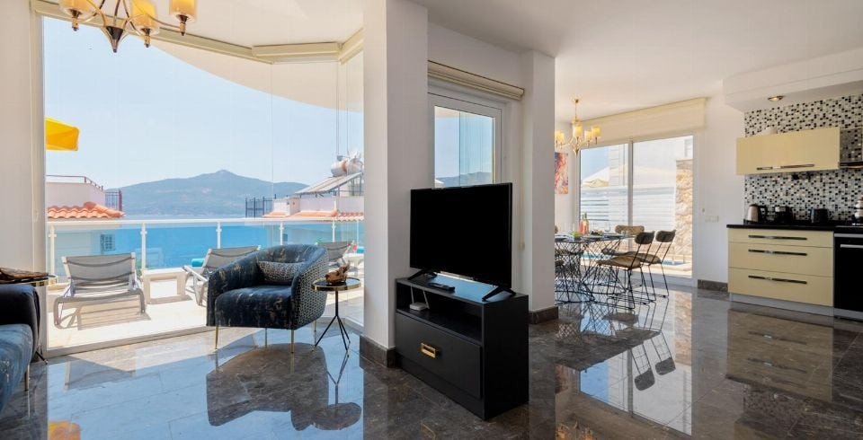 Salon: Deniz manzaralı modern Salona sahip olup Detayları; TV, uydu, oturma grubu, DVD, internet, klima, tuvalet ve lavabo bulunmaktadır.