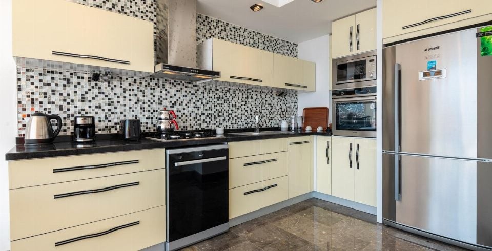 Mutfak: Deniz manzaralı Amerikan mutfak Detayları; Buzdolabı, çamaşır makinası, bulaşık makinası, yemek masası, su sebili, su ısıtıcısı, ekmek kızartma makinası, fırın, 4'lü ankastre ocak, mikro dalga ve mutfak araç gereçleri bulunmaktadır.