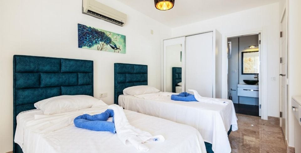 3. Yatak Odası: Süit yatak odası tek kişilik 2 yatak, klima, elbise dolabı, makyaj masası, komodin banyo ve lavabo bulunmaktadır.
