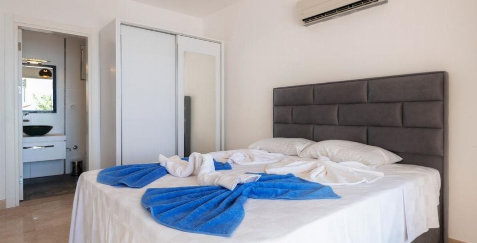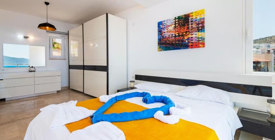 1. Yatak Odası: En süit yatak odası çift kişilik yatak, klima, komodin, makyaj masası, elbise dolabı, balkon, TV, banyo ve lavabo bulunmaktadır.