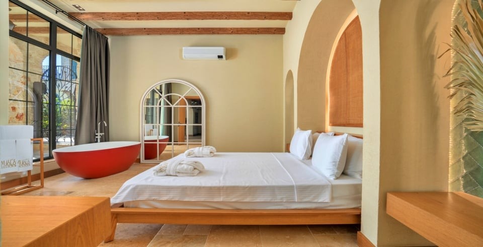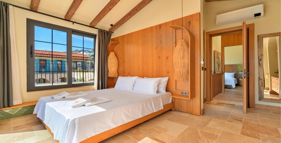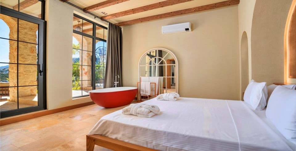 Kalkan merkeze, plajlara ve restoranlara kısa sürüş mesafesinde bulunan Villa Euterpe, huzur, konfor ve estetiği bir arada sunar. Her odasında ebeveyn banyosu, saç kurutma makinesi, kasa ve WiFi bağlantısı mevcuttur.