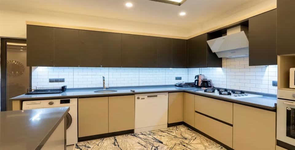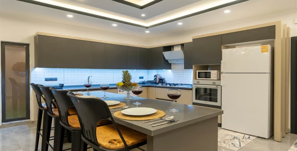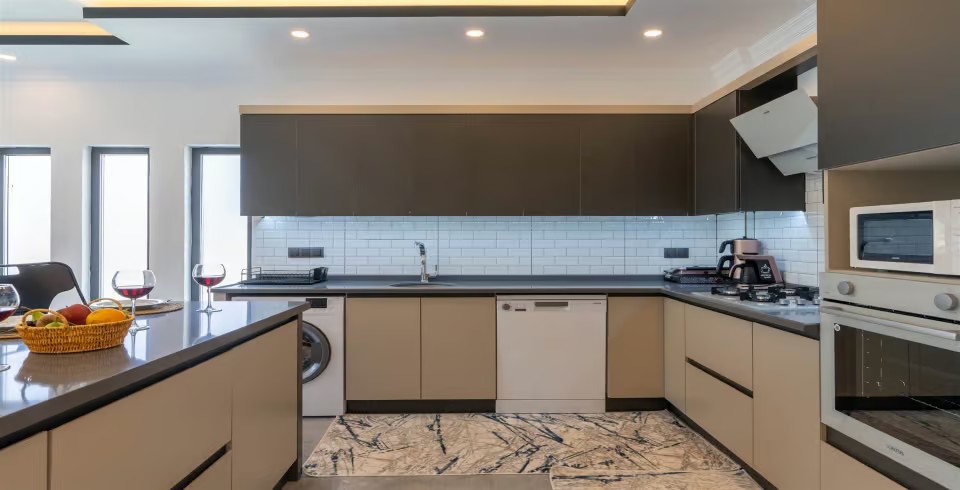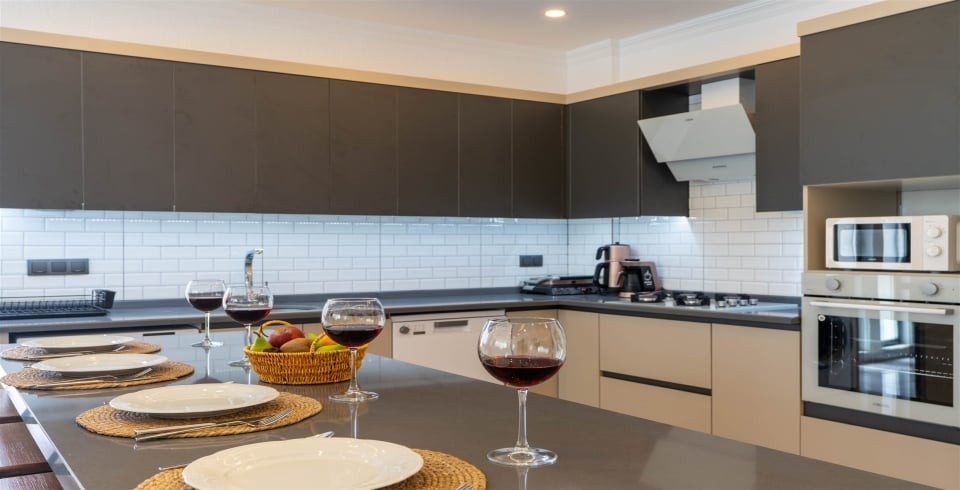 Mutfak : Ferah Amerikan tarzı mutfak, buzdolabı, bulaşık makinesi, yemek masası, fırın, 4'lü ocak, kettle, 4 kişilik yemek takımı, tava, tencereler, çatal, bıçak takımı bulunmaktadır.