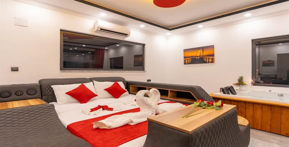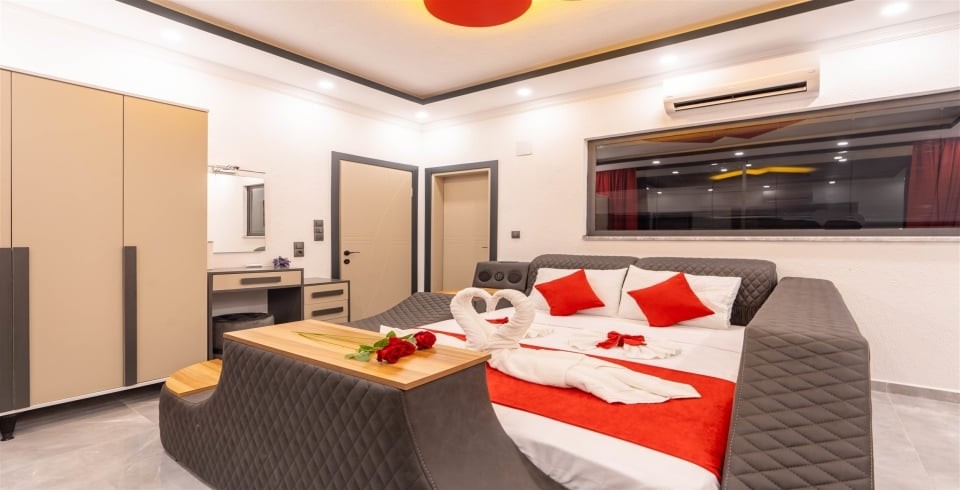 1. Yatak Odası : 1 adet çift kişilik akıllı yatak, klima, komodin, Jakuzi elbise dolabı, makyaj masası, banyo ve tuvalet bulunmaktadır.