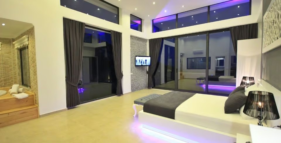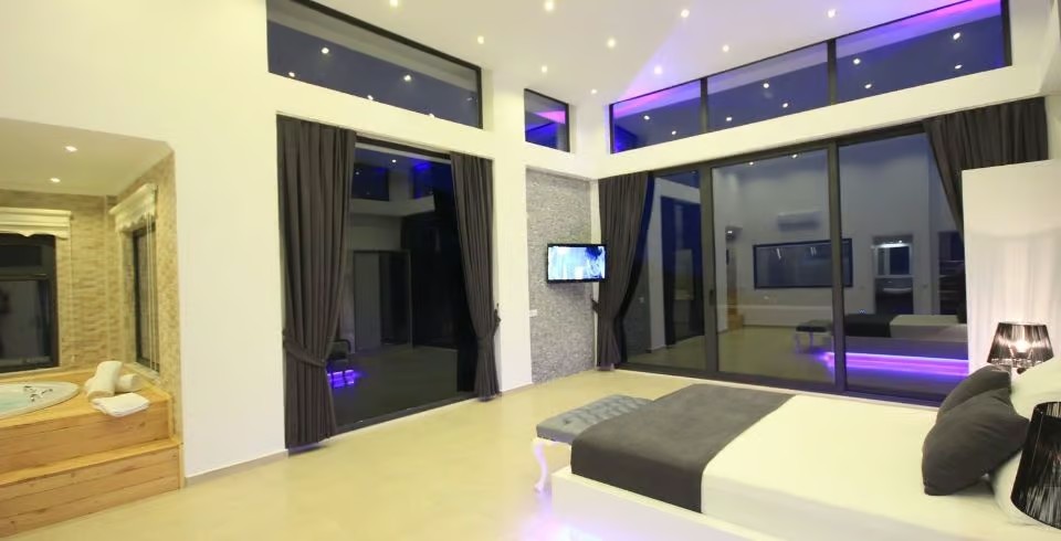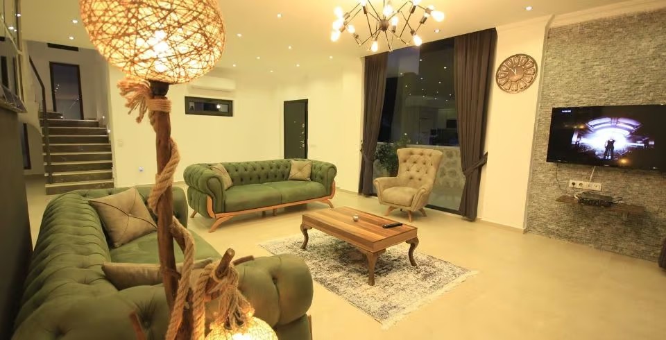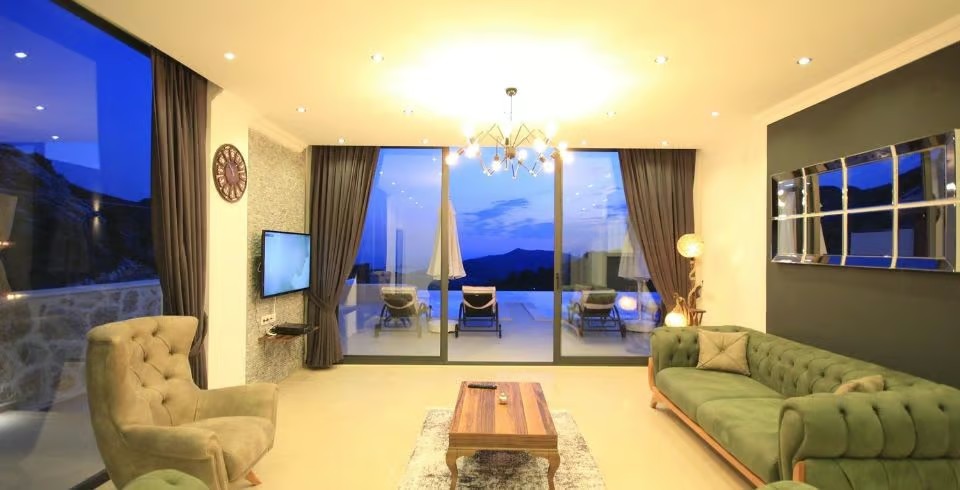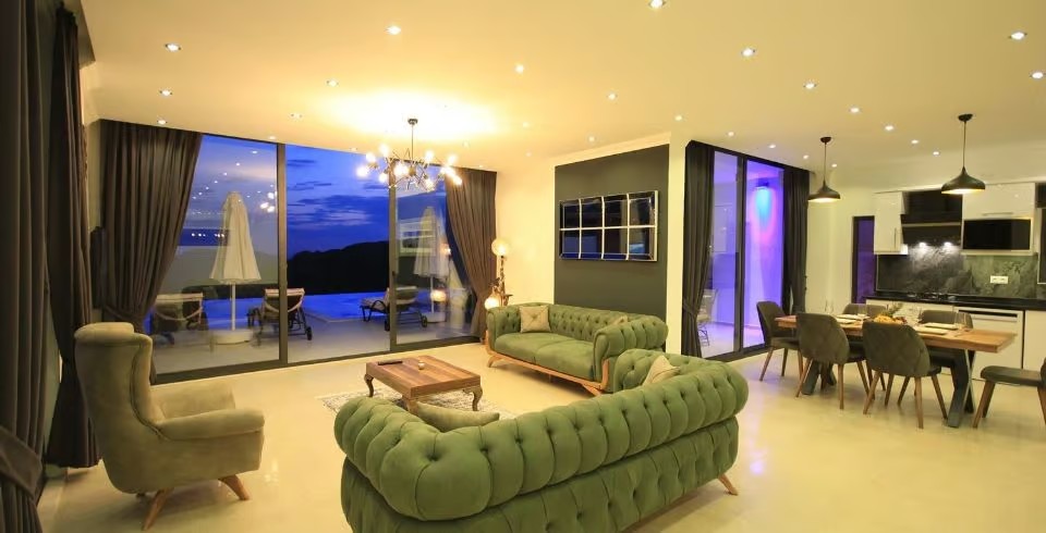 Salon: Villamızın Salonunda oturma grubu, TV, uydu, internet, klima, şömine ve havuz terasına çıkış yapılabilmektedir.
