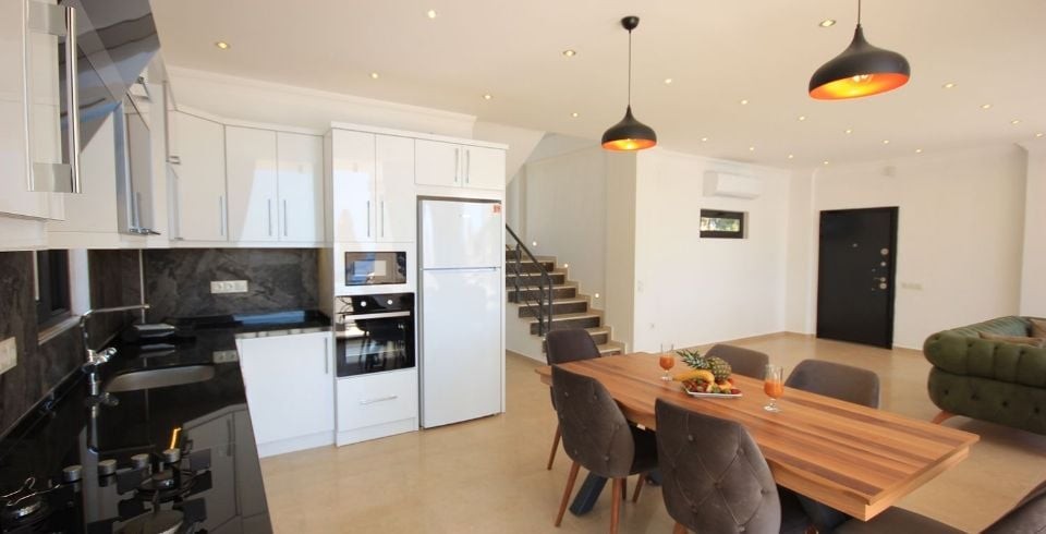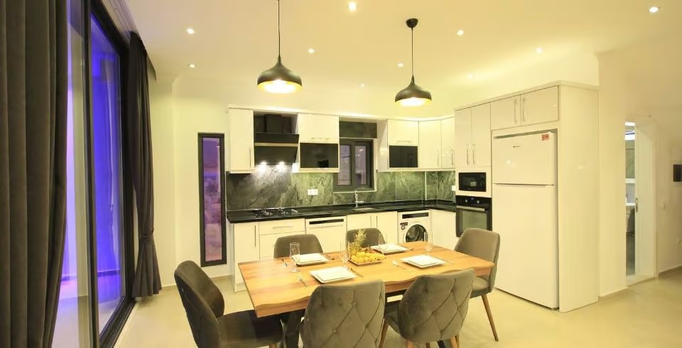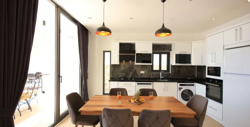 Mutfak: Geniş Amerikan mutfak, klima, yemek masası, buz dolabı, bulaşık makinası, çamaşır makinası, ankastre fırın, 4'lü ankastre ocak, ketil, ekmek kızartma, tost makinası bulunmaktadır.
