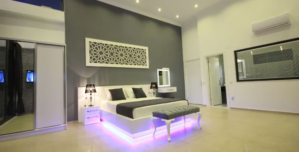 1, Yatak Odası: Çift kişilik süit yatak odası, klima, elbise dolabı, makyaj masası, komodin, banyo, lavabo ve jakuzi bulunmaktadır.