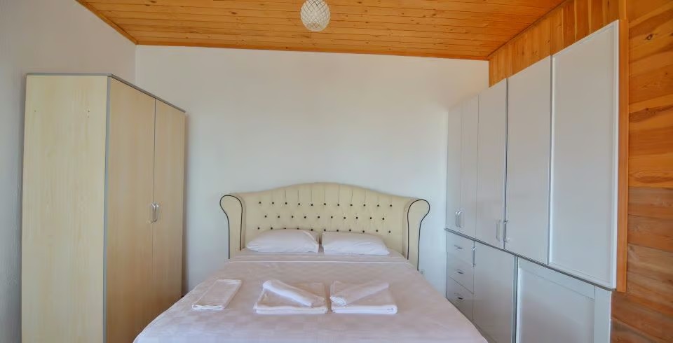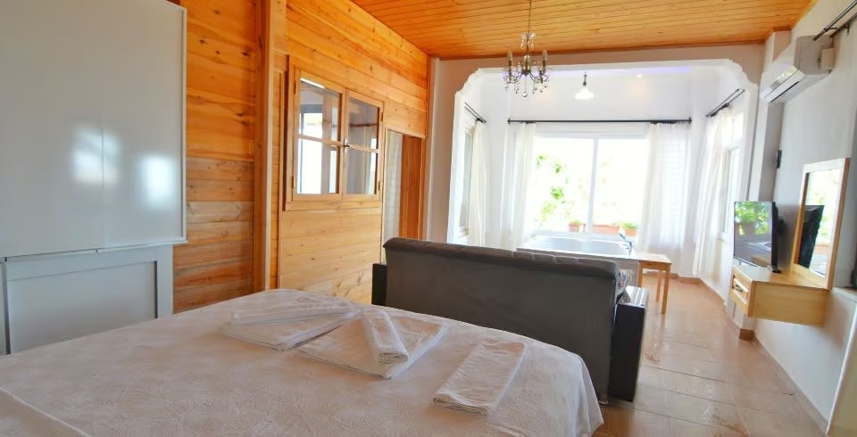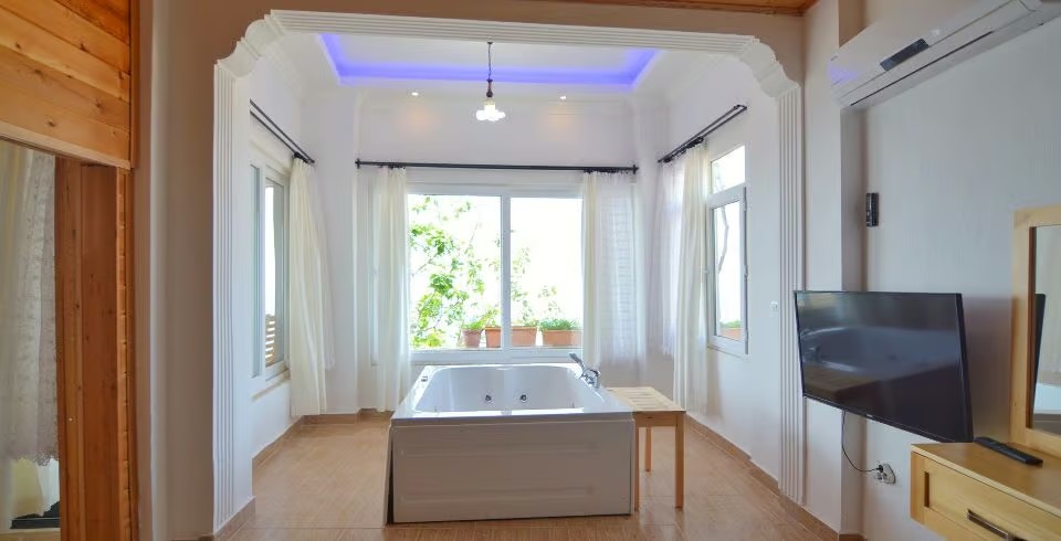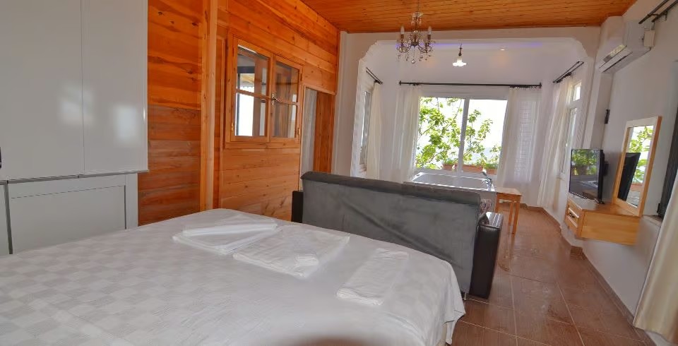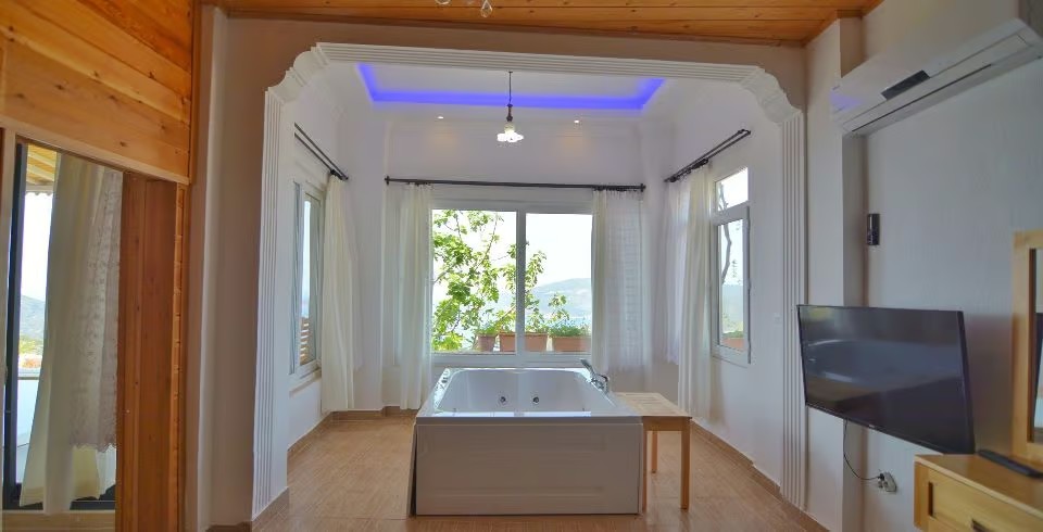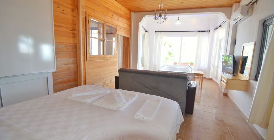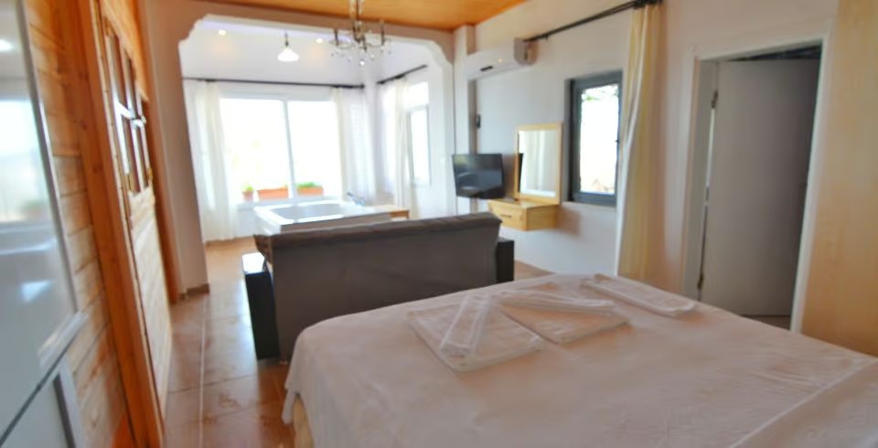 1. Yatak Odası : Çift kişilik yatak odamızda konforun tadını çıkarabileceğiniz, denize nazır jakuzi bulunmaktadır. Klima, elbise dolabı, makyaj masası, televizyon, tuvalet ve banyo bulunmaktadır.