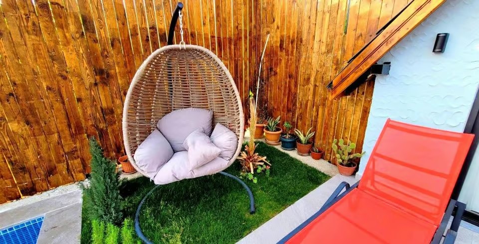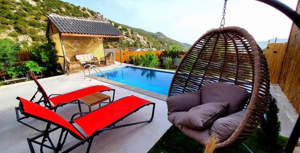 Havuz ve Bahçe : Bahçemiz tamamen korunaklı olup dışarıdan görünmemektedir. Villamızın havuz terasında şezlong, şemsiye, oturma grubu ve salıncak bulunmaktadır. Havuzun yan tarafında bahçede ise sizi yeşillikler içinde mangal bölümü ve bahçe mobilyası karşılamaktadır.