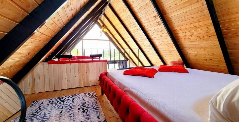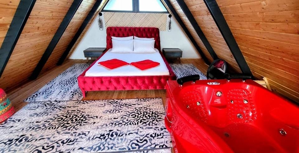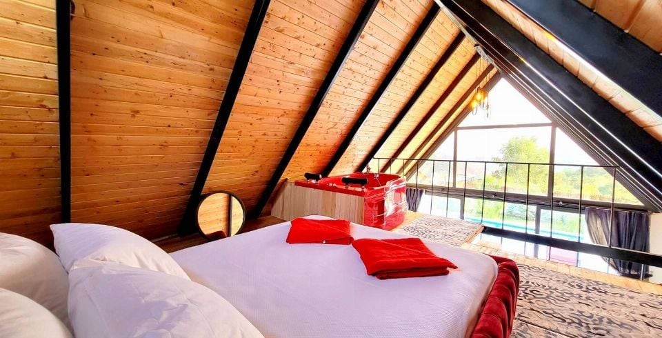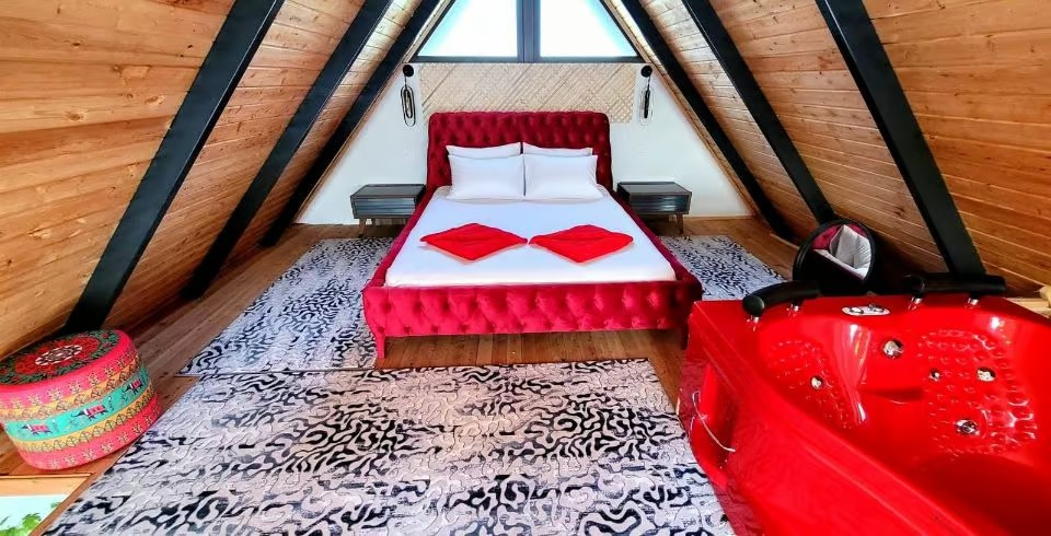 Yatak Odası : Çift kişilik balayı süit odamızda jakuzi, 1 adet çift kişilik yatak, klima, elbise dolabı, makyaj masası, komodin, banyo ve lavabo bulunmaktadır.