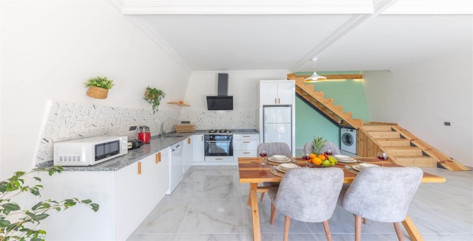 Mutfak : Amerikan açık mutfak ve salona sahip villamızın mutfağında buzdolabı, bulaşık makinası, ankastre ocak, fırın, mikrodalga, 4'lü ankastre ocak, kettle, çamaşır makinası, yemek masası ve temel mutfak araç ve gereçleri bulunmaktadır.