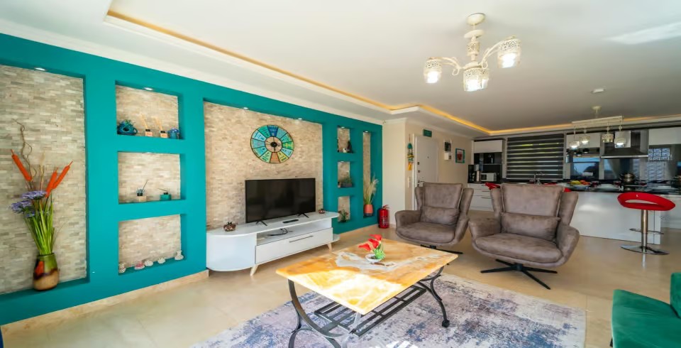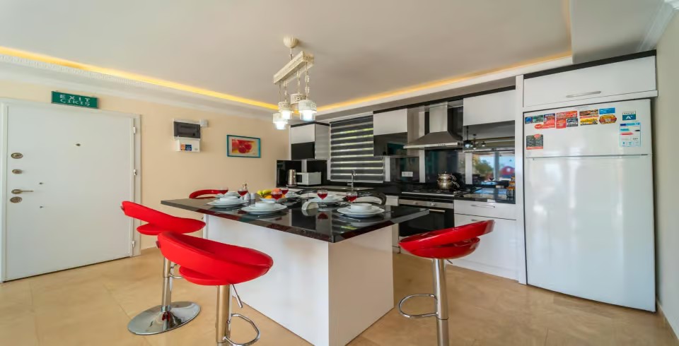 Mutfak : Mutfağında amerikan mutfak 4 kişilik yemek takımı, buzdolabı, çamaşır makinası, mikrodalga fırın, 4 lü ocak, ekmek kızartma makinası, kettle , çatal bıçak  takımı, tencere tava takımı, bulaşık makinası bulunmaktadır.