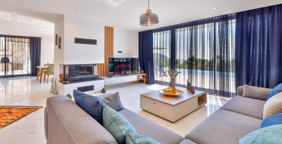 Salon: Sizi şık bir oturma grubu ile klima, televizyon, internet, uydu, koltuk, sehpa ile ferah bir salon bekliyor olacaktır. Havuz terasına çıkış yapılmaktadır.