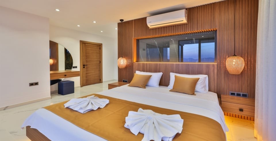 1.Yatak Odası: 1 adet çift kişilik yatak, klima, komodin, makyaj masası, jakuzi, tuvalet banyo, balkona çıkış bulunmaktadır.