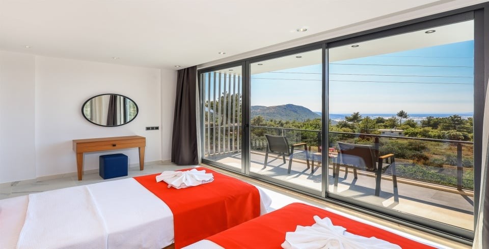 2. Yatak Odası: 2 adet tek kişilik yatak, klima, komodin, makyaj masası, elbise dolabı, banyo ve lavabo bulunmaktadır.