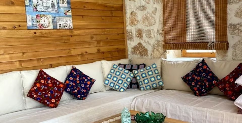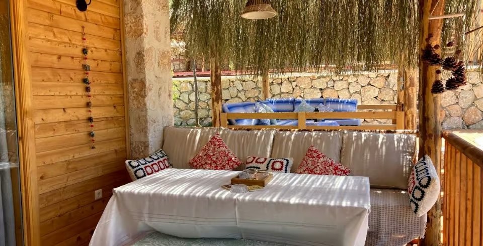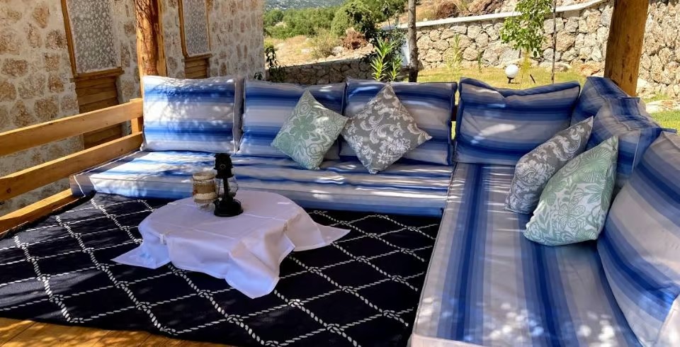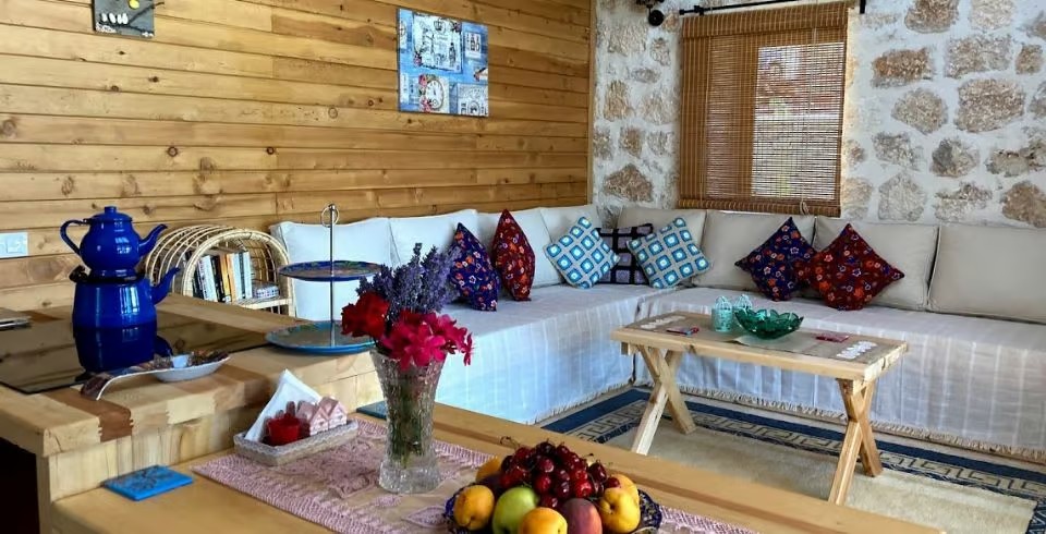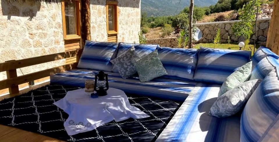 Salon : Badem Ev'e girdiğiniz anda sizi yüksek tavanlı, ahşap ve doğal taş dokunun sarmaladığı sıcak bir ortam bekliyor. Geniş cam yüzeylerden sizi kucaklayan Kaputaş Vadisi ve Akdeniz'in sonsuz ufku aydınlık ve ferah bir mekanın parçası olarak karşınıza çıkıyor. Geleneksel sedirli oturma odanızda en sevdiğiniz kitabınızı okuyabilir, televizyon seyredebilir ya da yalnızca yanı başınızda sizi saran huzur dolu doğanın keyfini çıkarabilirsiniz. Havuz terasının bir kademe üzerinde bulunan balkona çıkan salonda TV, sedir oturma grubu, sehpa bulunmaktadır. Salonumuz dağ manzaralıdır.