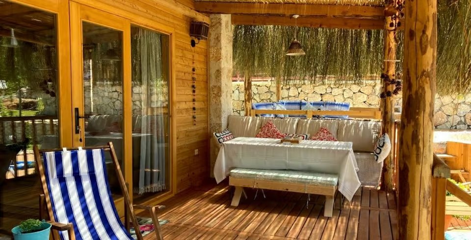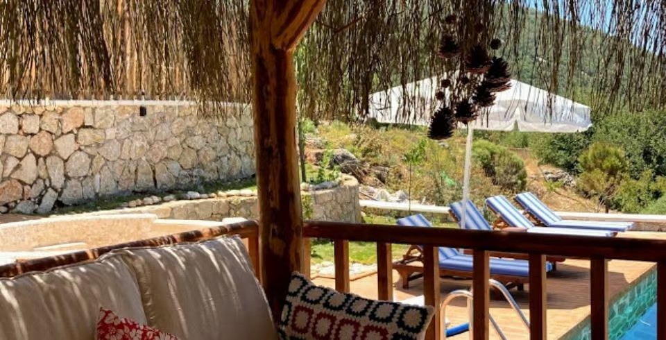 Bahçe : Manzaraya ve güney yönüne hakim ahşap veranda konforunuz ve keyifli anlarınız için tasarlandı. Geleneksel köy ocaklıklarından esinlenerek yapılan açık şömineniz odun ateşi keyfini yaşayabilmeniz, aynı zamanda unutulmaz lezzetler pişirebilmeniz için. Doğanın günlük ritmini hissedebileceğiniz, kuş seslerini ve çobanların çıngıraklarını dinleyebileceğiniz serin, huzurlu ve konforlu bir mekan. Özel bahçede güneşlenme alanı, özel havuz, şezlonglar, güneş şemsiyesi, bahçe masası ve sandalyeler, 4-5 kişilik veranda bulunmaktadır.