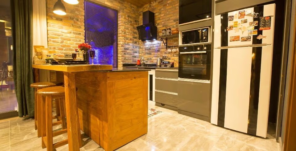 Mutfak : Villamızın geniş Amerikan mutfağı ile sizlere kendi evinizin mutfağı gibi hissettirecek. Ayrıca mutfakta klima, bulaşık makinası, buzdolabı, çamaşır makinası, mikrodalga fırın, tost makinası, su ısıtıcısı, fırın, 4`lü ocak seti ve 2 kişilik geniş yemek masası ile tava tencere vb. mutfak araç gereçlerini kullanma fırsatını sizlere sunuyoruz.