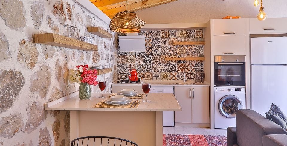 Mutfak : Modern Amerikan mutfak içerisinde 4 kişilik yemek masası, mama sandalyesi, buzdolabı, bulaşık makinası, fırın, ocak, mikrodalga fırın, tost makinası, yemek masası, yemek takımları, çatal ve bıçak takımları, tencere ve tava takımları, bardaklar bulunmaktadır.