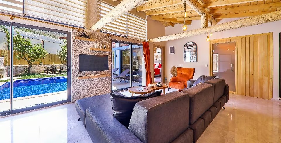 Salon : Salon içerisinde oturma grubu, TV, klima, sehpa bulunmaktadır. Havuz terasına çıkış yapılabilmektedir.