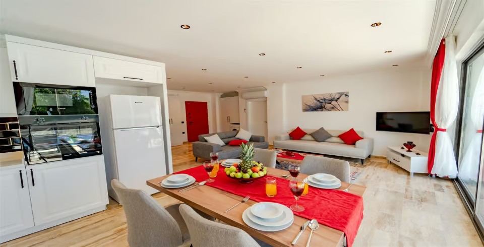 Mutfak : Buzdolabı, çamaşır makinesi, mikrodalga fırın, fırın, 4’lü ocak, çatal-bıçak takımı, tencere-tava takımı, bulaşık makinesi bulunmaktadır.