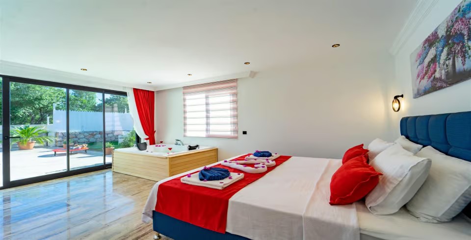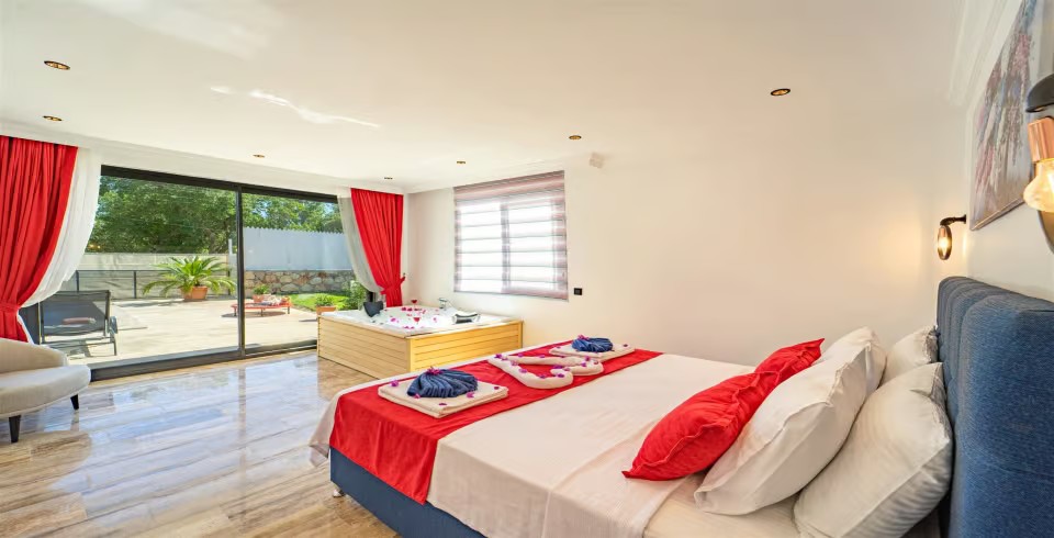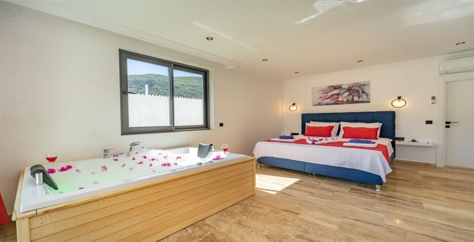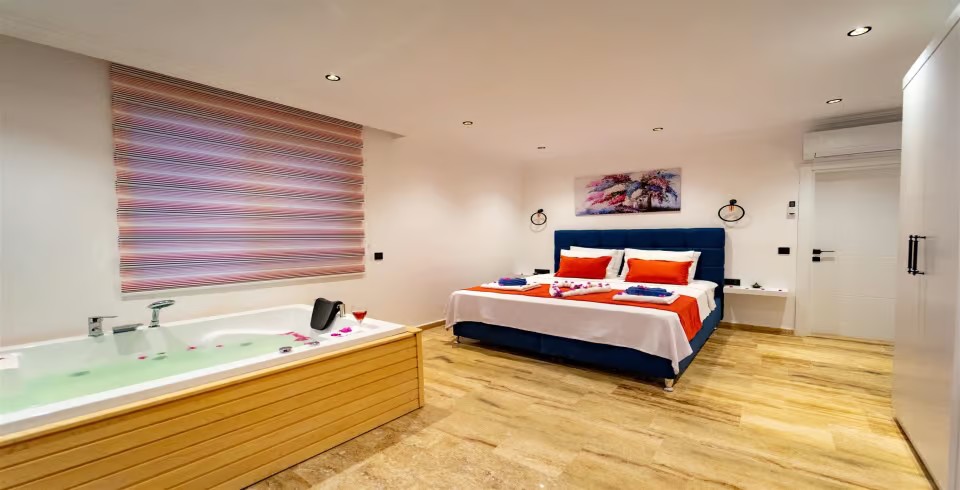 1. Yatak Odası : Çift kişilik yatak, klima, komodin, jakuzi, elbise dolabı, banyo ve lavabo bulunmaktadır.