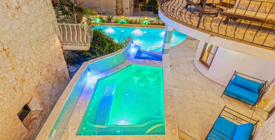 Havuz ve Bahçe: Villamızın geniş kullanım alanı bulunan bahçe katında özel yüzme havuzu, şezlonglar, güneş şemsiyesi, barbekü, bahçe masası ve sandalyeler bulunmaktadır.