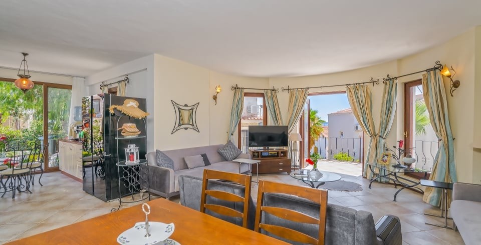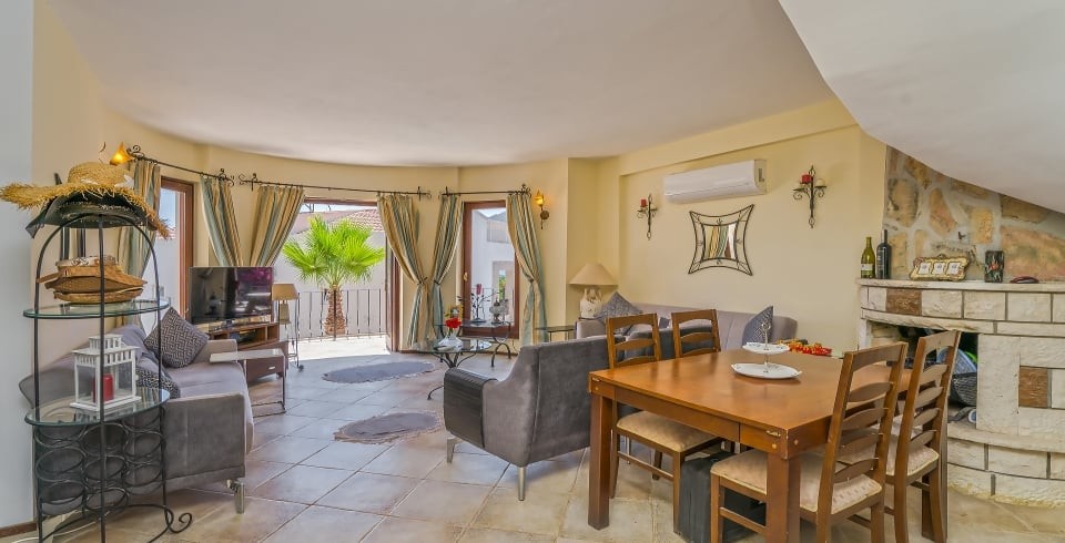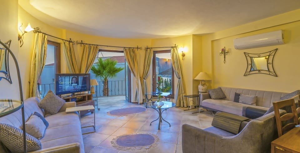 Salon: Villamızın geniş ve ferah salon katı içerisinde oturma grubu,  LCD TV, yemek masası, kablosuz modem, uydu, sehpa, ütü, ütü masası, elektrik süpürgesi, klima, banyo ve tuvalet bulunmaktadır. Salondan havuz terasına direk çıkış yapılabilmektedir.