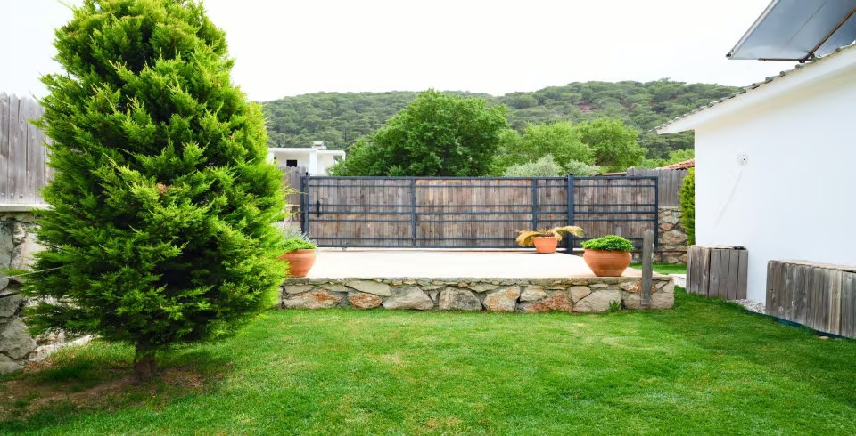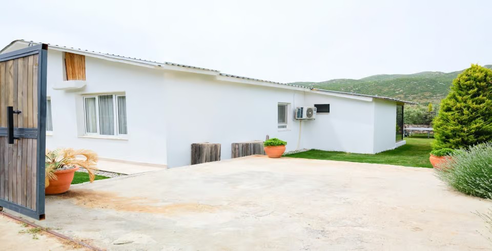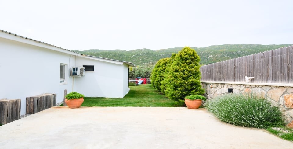 Plaj yaklaşık 15 km mesafede, market 2 km, restoran 10 km uzaklıktadır; şehir merkezi 15 km yolculukla erişilebilirdir. Çitlerle korunaklı bahçe ve tek katlı yapısıyla mahremiyet ön plandadır.
