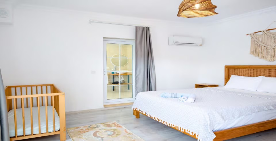 1.Yatak Odası:  1 adet çift kişilik yatak, elbise dolabı, komodin, klima, jakuzi, banyo ve lavabo bulunmaktadır.