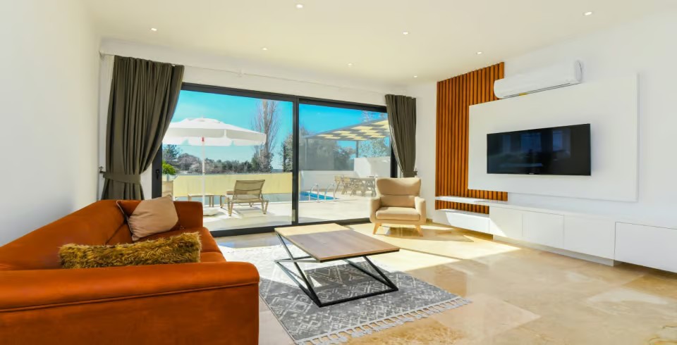 Salon : Kiralık Villamızın salonunda konforlu oturma grubu, klima, TV, internet, uydu alıcı, yemek masası, sehpa bulunmaktadır.