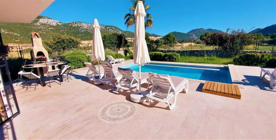 Havuz ve Bahçe : Havuz terası korunaklı olup dış taraftan gözükmemektedir. Villamızın havuz terasında şezlong, şemsiye, barbekü ve bahçe yemek masası bulunmaktadır.