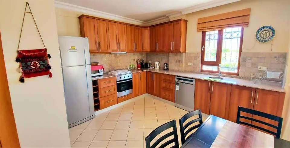 Mutfak : Modern Amerikan mutfakta buzdolabı, bulaşık makinası, 4'lü ocak, fırın,mikro dalga, kettle, 6 kişilik yemek masası, yemek takımları, çatal ve bıçak takımları, tencere ve tava takımları, bardaklar bulunmaktadır.