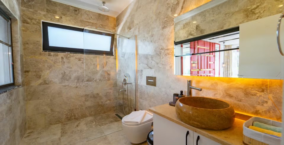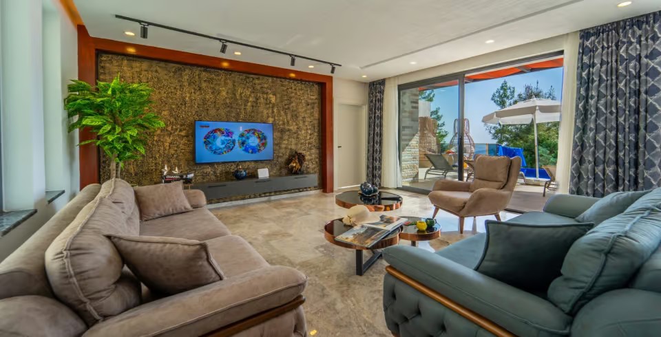Salon: Villamızın  salonunda konforlu oturma grubu, klima, TV, internet, uydu alıcı, yemek masası, sehpa bulunmaktadır.