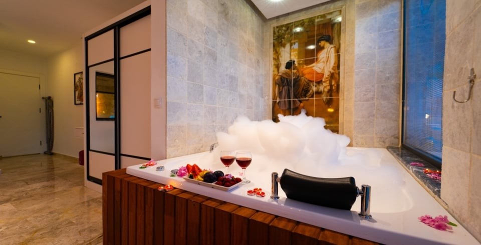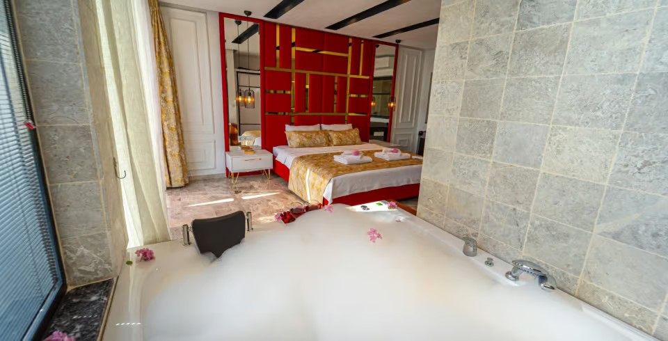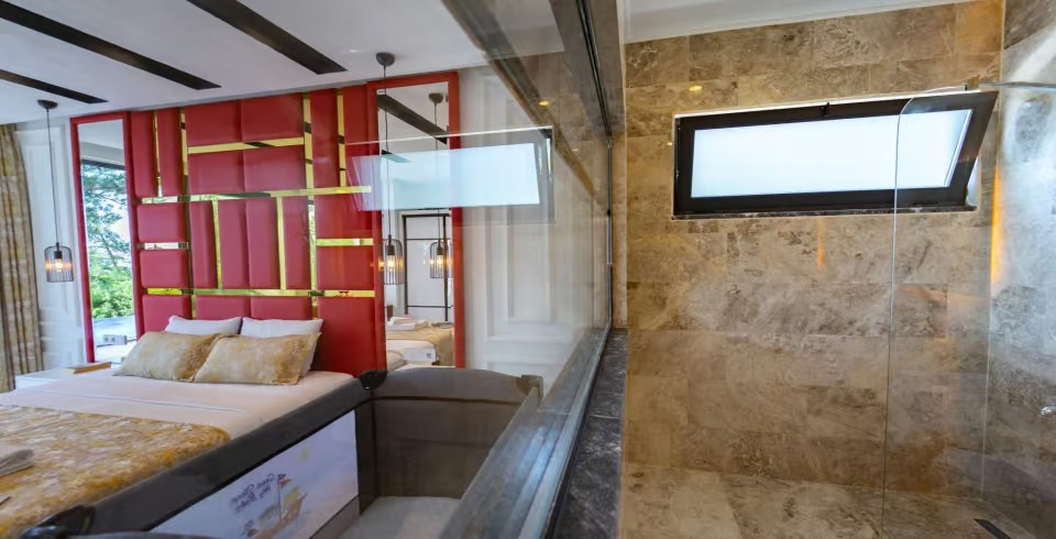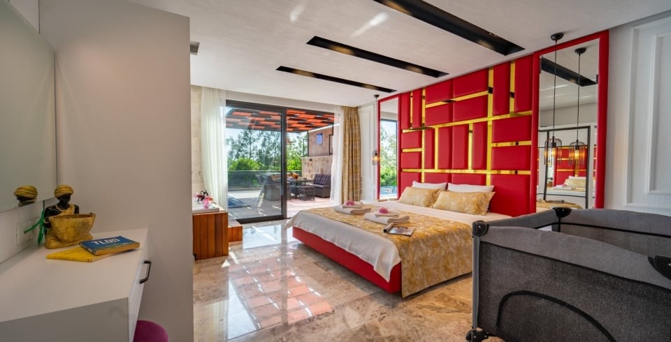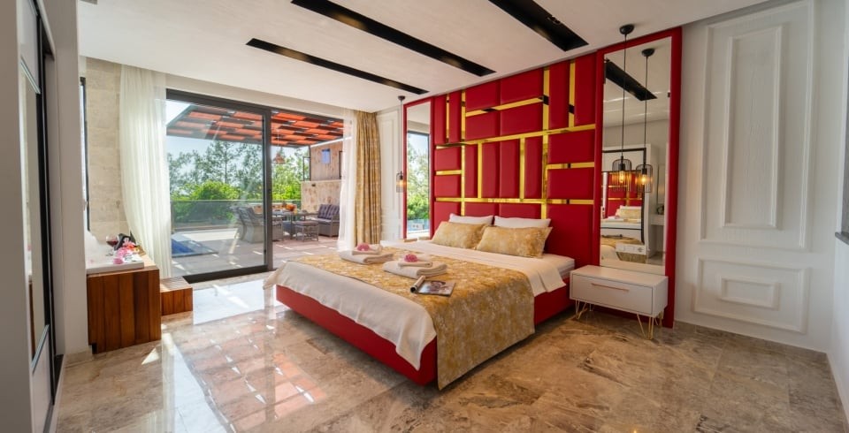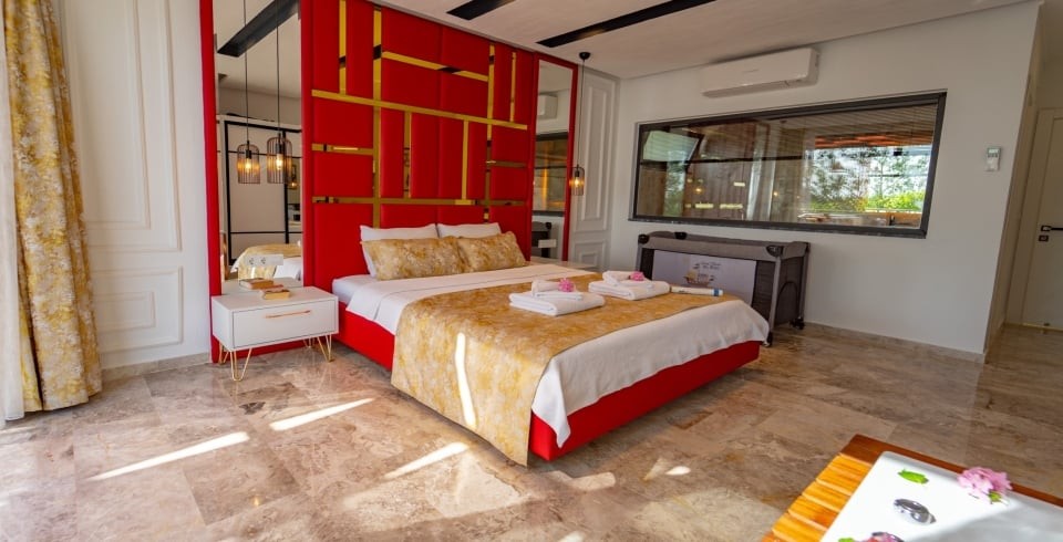 1. Yatak Odası: Çift kişilik yatak, klima, jakuzi,  komodin, elbise dolabı, makyaj masası, banyo ve tuvalet bulunmaktadır.