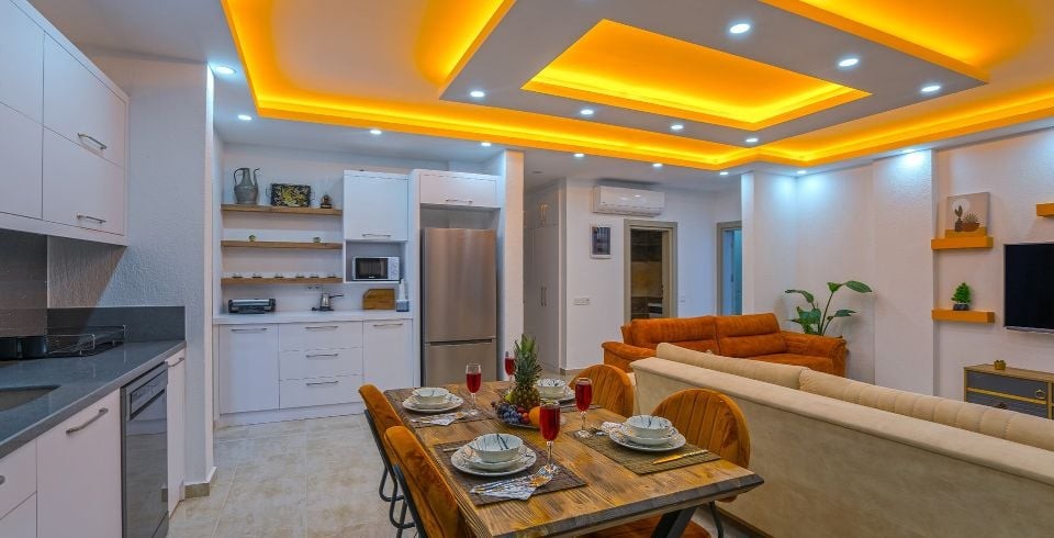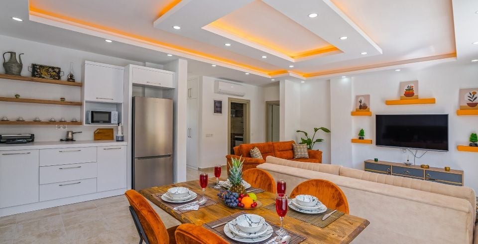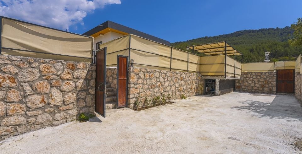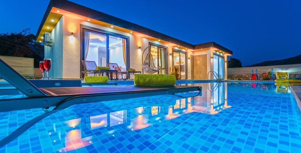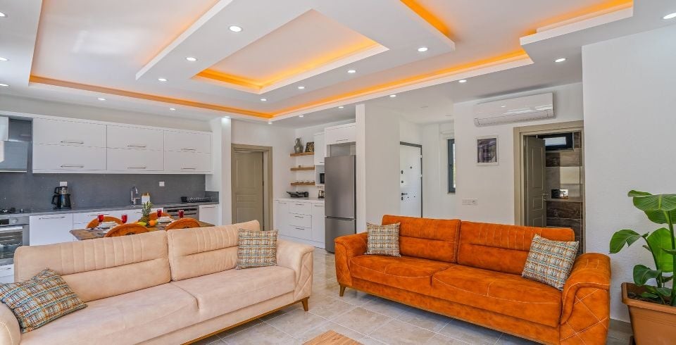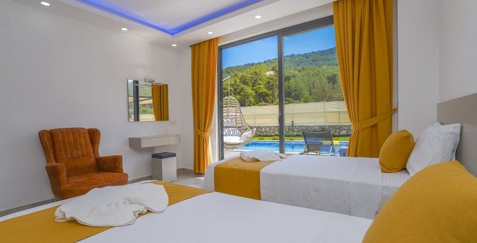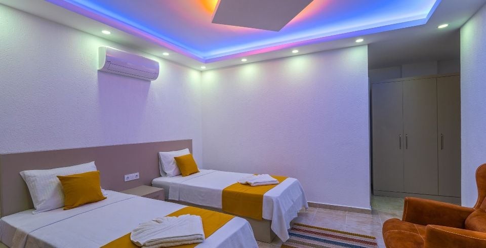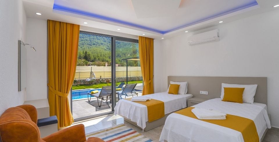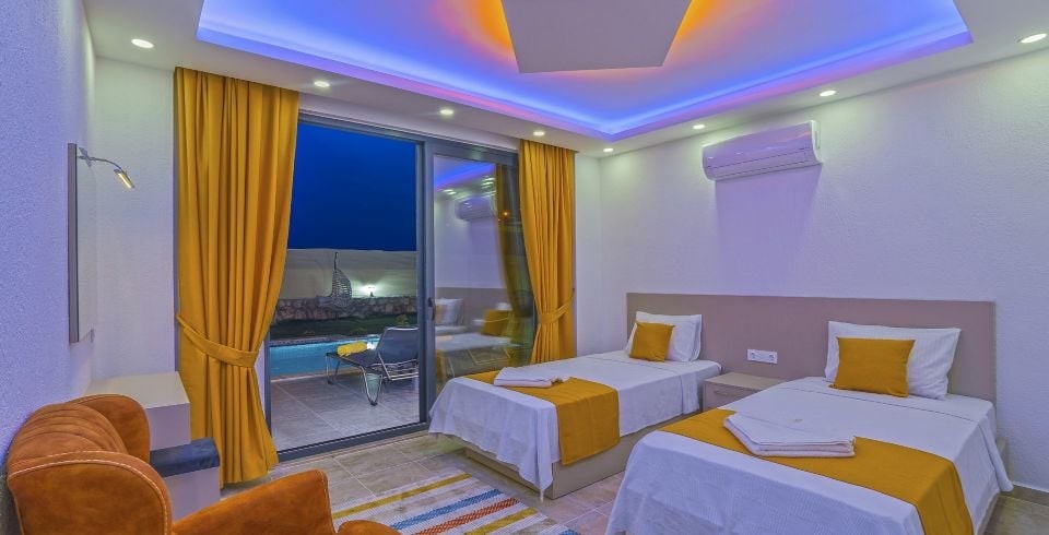 Villa Gökalan, Kalkan’ın Sarıbelen bölgesinde, doğa ile iç içe huzurlu bir konumda yer alıyor. İki yatak odası ve iki banyoyu kapsayan modern dizaynı, çekirdek aileler ya da balayı çiftleri için özel bir tatil ortamı sunar. Ebeveyn yatak odasında çift kişilik yatak, jakuzi, klima ve özel banyo bulunurken; çocuk ya da arkadaş grubu için uygun ikinci yatak odasında iki tek kişilik yatak, klima ve banyo yer alır. Salon açık plan mutfak ile birleşir; konforlu oturma grubu, TV, wifi ve klima donatımı unutamayacağınız bir tatil konforu sağlar.