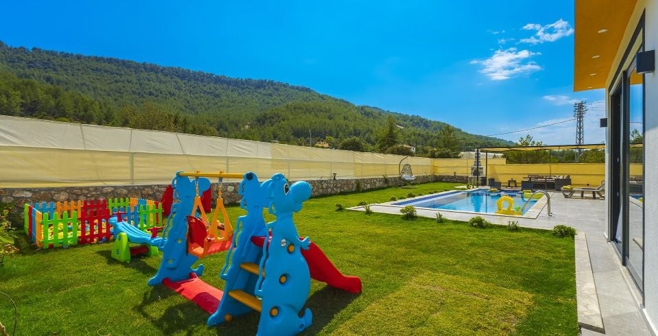 Havuz ve Bahçe: Havuz ve bahçesi korunaklı olup dışarıdan gözükmemektedir. Özel yüzme havuzu, şezlong, şemsiye, salıncak, çocuk oyun parkı yemek masası ve barbekü bulunmaktadır.
