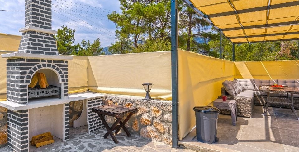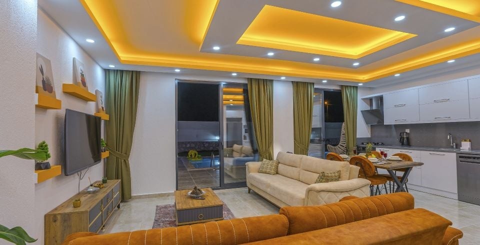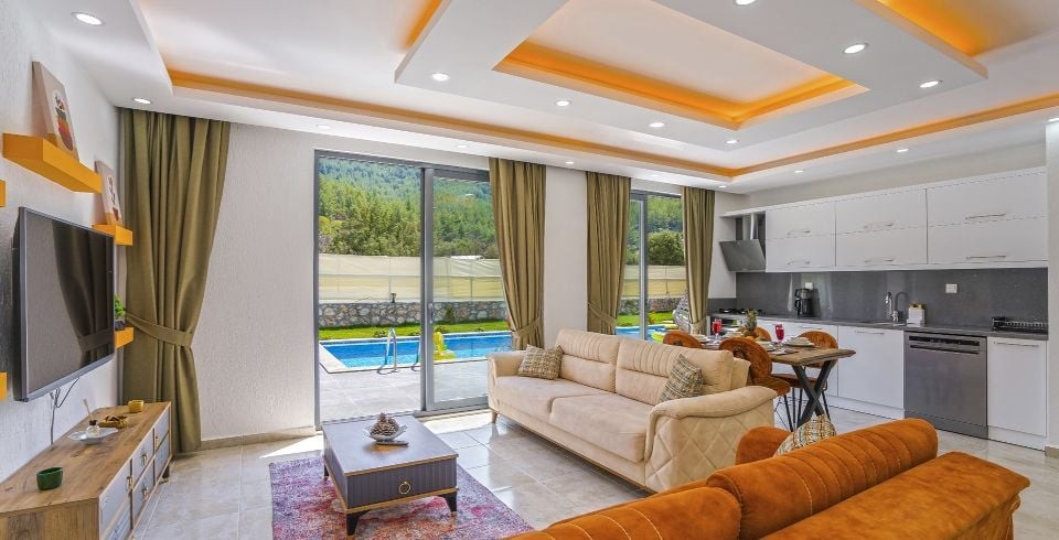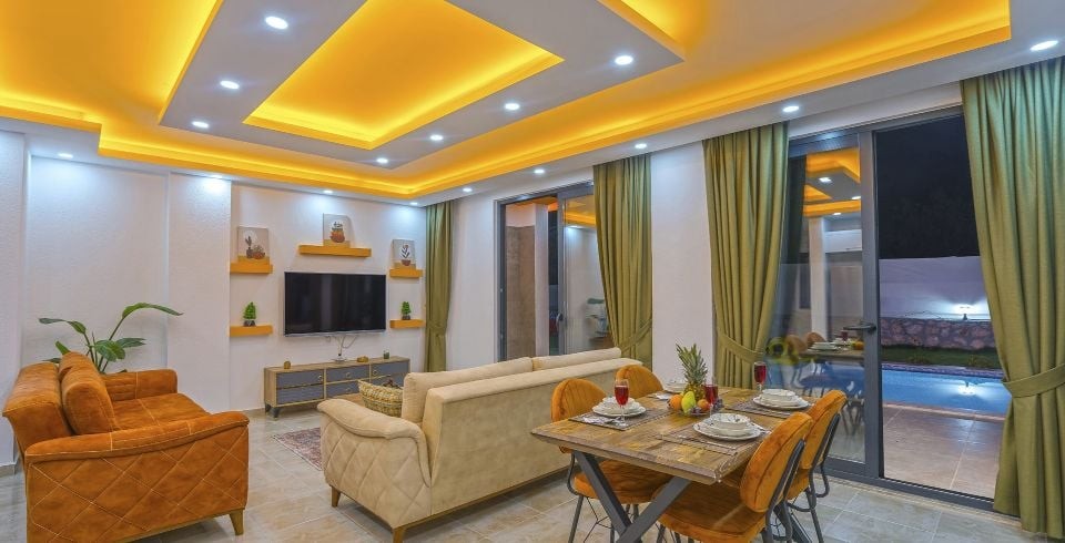 Salon: Villamızın salonunda konforlu oturma grubu, klima, TV, internet, uydu alıcı, yemek masası, sehpa,ve lavabo / WC bulunmaktadır.