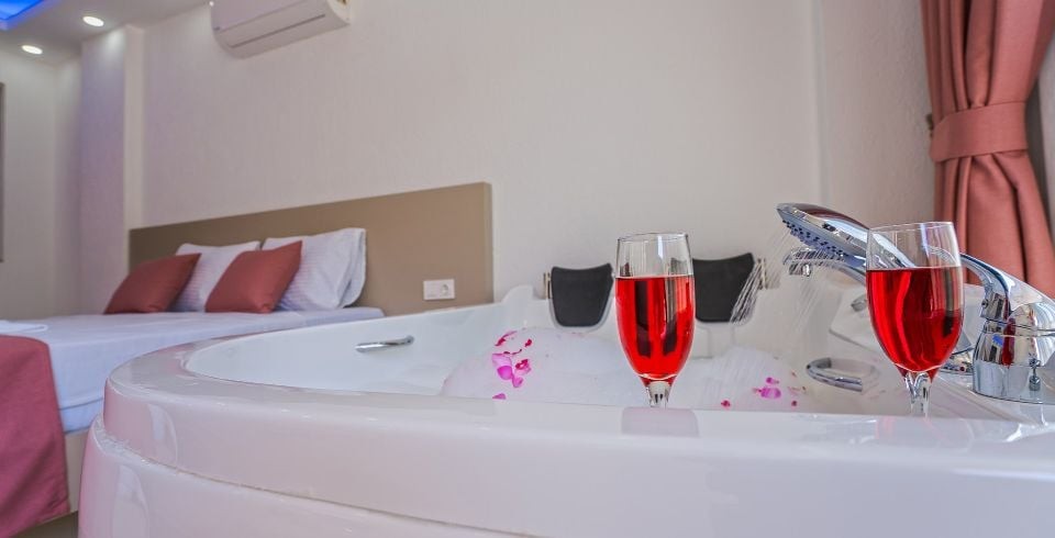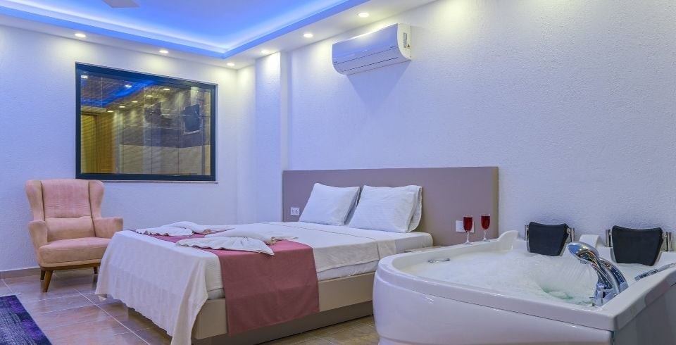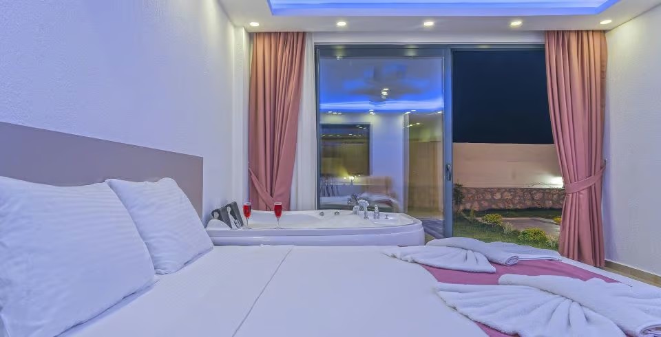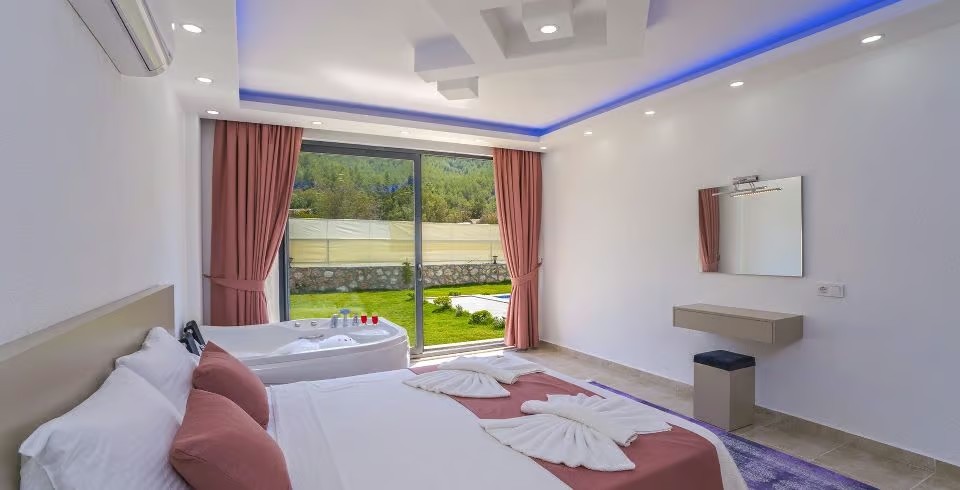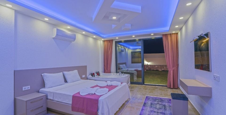 1. Yatak Odası: Çift kişilik yatak, klima, jakuzi, komodin, elbise dolabı, makyaj masası, banyo ve tuvalet bulunmaktadır.