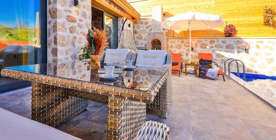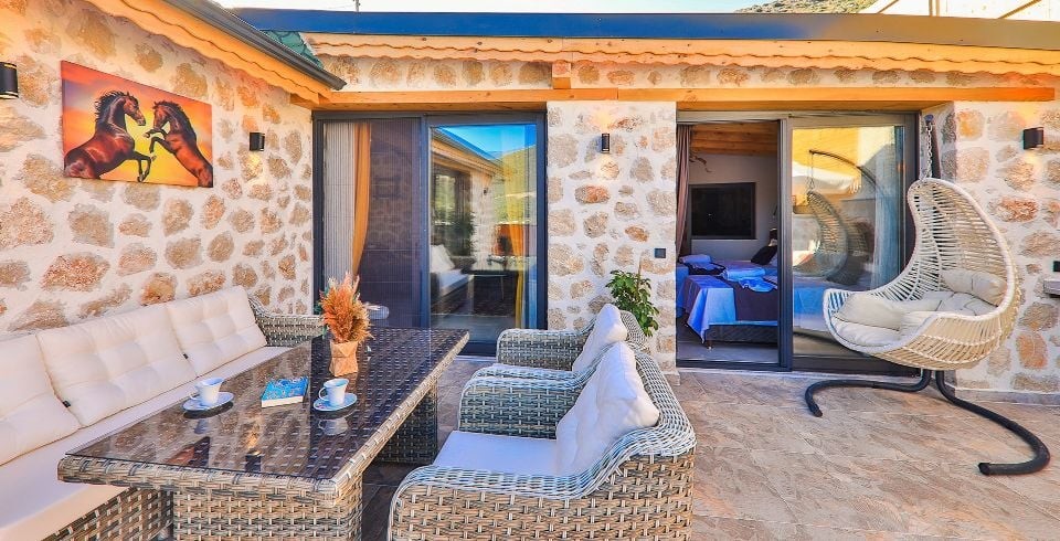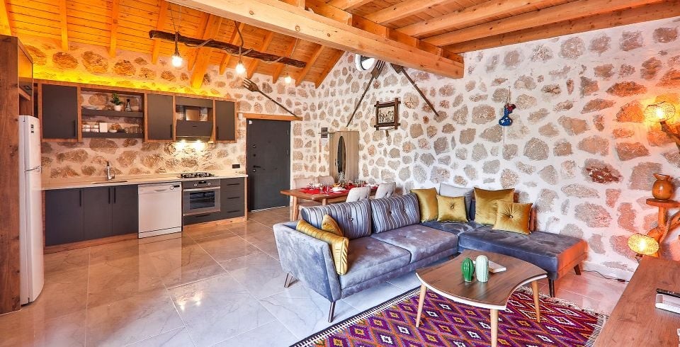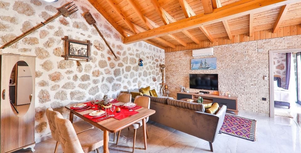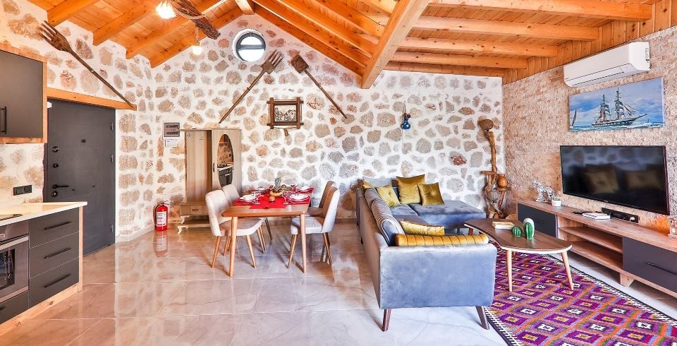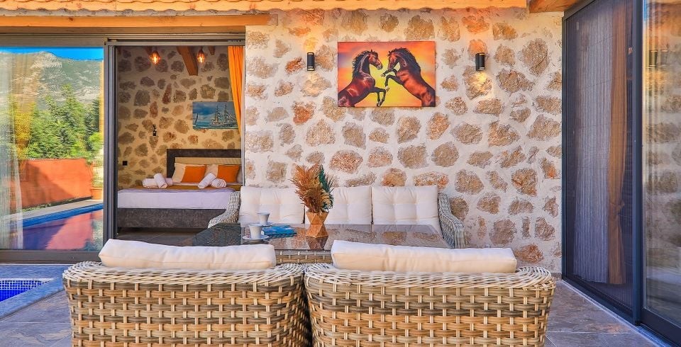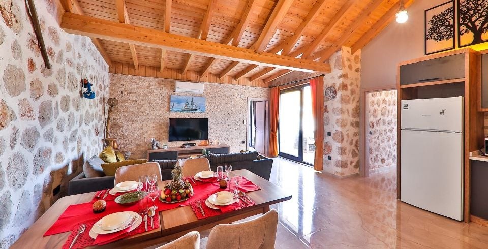 Salon : Villa  salonunda konforlu oturma grubu, klima, TV, internet, uydu alıcı, yemek masası, sehpa bulunmaktadır.