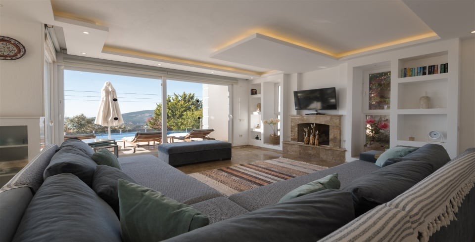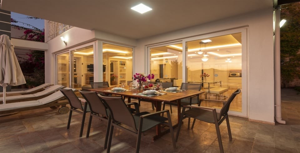 Salon : Kiralık Villamızın salonunda TV, oturma grubu, uydu alıcı, WİFİ, yemek masası ve havuz çıkışı bulunmaktadır.