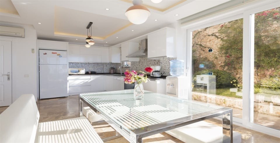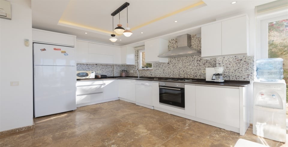Mutfak : Kiralık  Villamızın Amerikan mutfağında buzdolabı, çamaşır makinası, bulaşık makinası, ketıl, ekmek kızartma, mikrodalga fırın, 4lü ocak,8 kişilik yemek takımı, yemek masası bulunmaktadır.
